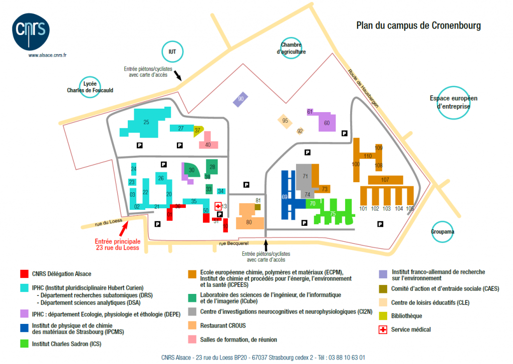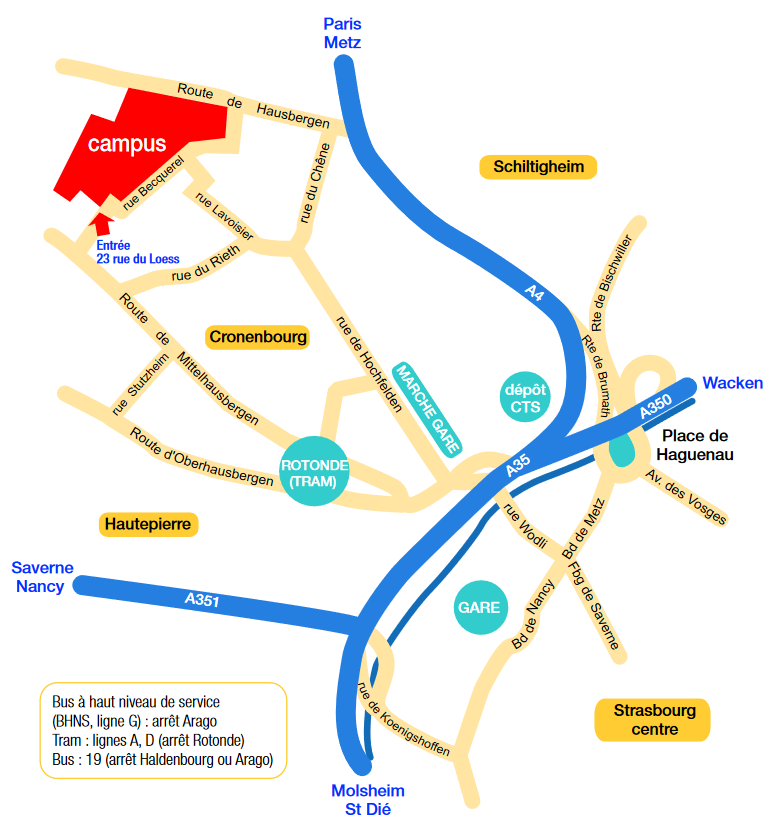 By car Coming from the south of Strasbourg via the A35 motorway or from Entzheim airport: take exit 1 direction Cronenbourg, then follow the campus access plan. Coming from the train station or the city center: at the intersection between President Wilson Boulevard, Rue du Faubourg Saverne and Rue Georges Wodli, take the latter and Rue de la Gare au Marchandises, then follow the campus access plan. Coming from Karlsruhe-Baden airport in Germany: follow the B500 towards France then the A35 motorway towards Strasbourg, exit Cronenbourg, then follow the access plan to the campus. |