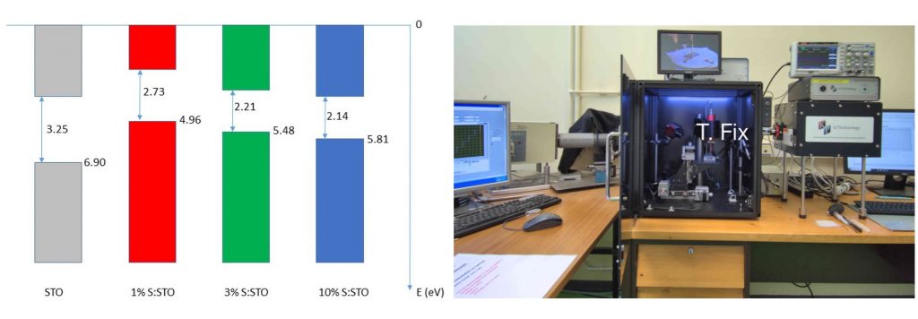 (left) Energy levels of SrTiO3 implanted with Sulfur (right) Scanning Kelvin probe – SPV – SPS -APS photoemission system