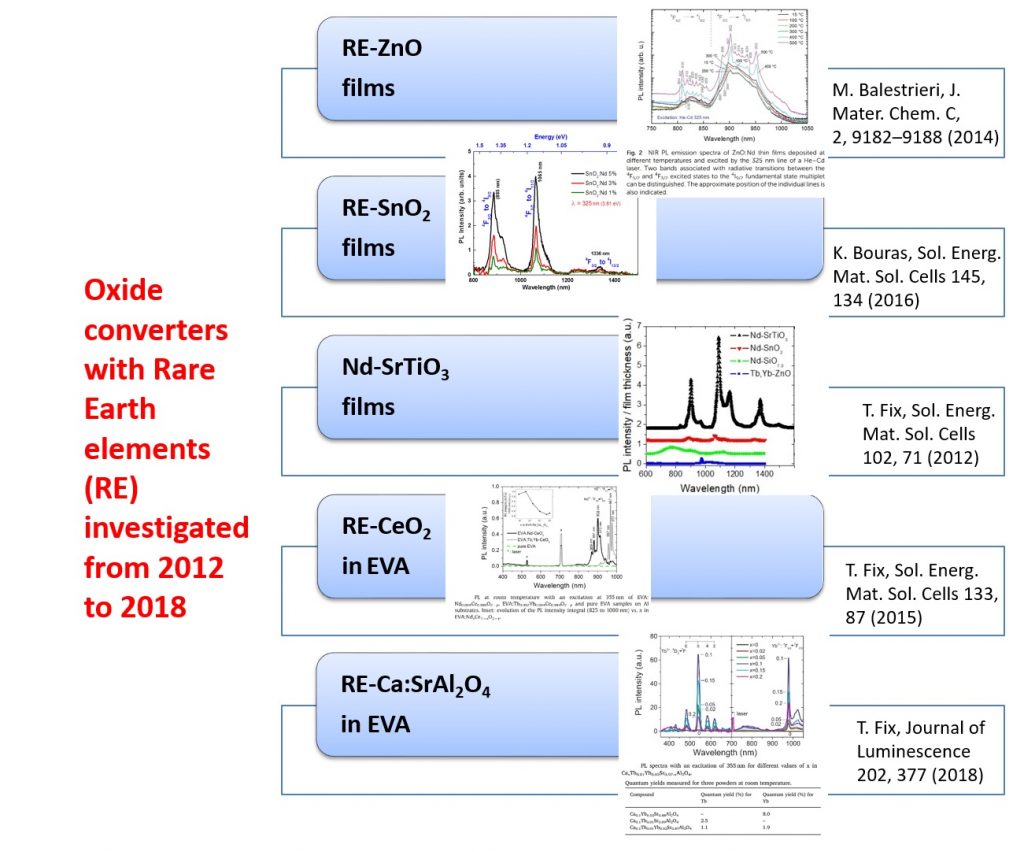 As well, emerging oxide materials are developed for the role of photon absorber in solar cells. Inorganic photovoltaic technologies are mainly based on CdTe, amorphous Si and CuInxGa1-xSe2 (CIGS). A recent major breakthrough was demonstrated with perovskite halides, with conversion efficiencies higher than 20% using a small surface and not stabilized. Another path is the use of metal oxides based on abundant elements, generally stable and non-toxic.