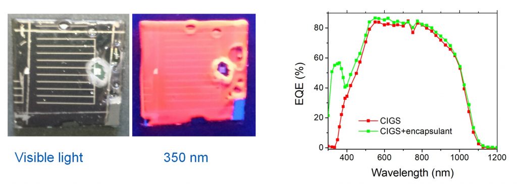 Several phenomena limit the efficiency of solar cells (c-Si, CIGS…), such as the thermalization of photons with energy higher than the bandgap or the low spectral response in the ultraviolet (window layers…). A possible solution is to better match the bandgaps to the solar spectrum by fabricating tandem solar cells. Another solution is to adapt the solar spectrum to the existing solar cell by converting ultraviolet photons towards the visible or near-infrared before being absorbed by the cell. Downshifting and downconversion consist in converting an ultraviolet photon into respectively 1 or 2 photons in the visible or near-infrared. We study several downshifting and downconversion systems, in the form of oxide thin films or polymers functionalized with coordination complexes. Our functionalized encapsulants with photon conversion by photoluminescence allow an increase of conversion efficiency from 13.5 to 14.3 % in CIGS solar cells.